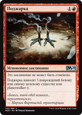 Поджарка наносит 5 повреждений белому или синему целевому существу или planeswalker-у.
