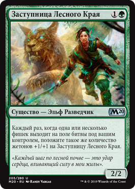 Каждый раз, когда одна или несколько фишек выходит на поле битвы под вашим контролем, положите такое же количество жетонов +1/+1 на Заступницу Лесного Края.