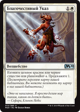 Изгоните целевое красное или черное существо или planeswalker-а. Предскажите 1. (Посмотрите верхнюю карту вашей библиотеки. Вы можете положить ту карту в низ вашей библиотеки.)