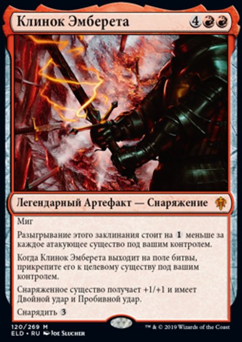 Когда Клинок Эмберета выходит на поле битвы, прикрепите его к целевому существу под вашим контролем.