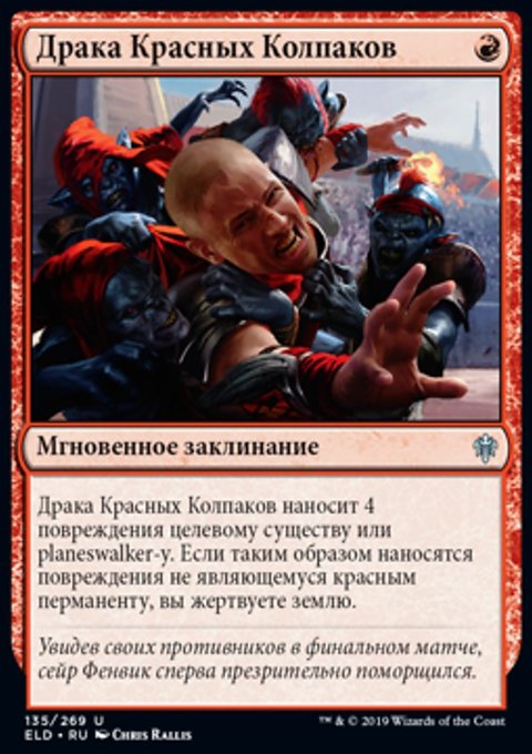 Драка Красных Колпаков наносит 4 повреждения целевому существу или planeswalker-у. Если таким образом наносятся повреждения не являющемуся красным перманенту, вы жертвуете землю.