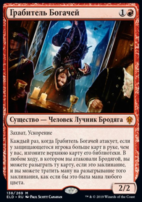 Каждый раз, когда Грабитель Богачей атакует, если у защищающегося игрока больше карт в руке, чем у вас, изгоните верхнюю карту его библиотеки. В любом ходу, в котором вы атаковали Бродягой, вы можете разыграть ту карту, если это заклинание, и вы можете тратить ману на разыгрывание того заклинания, как если бы это была мана любого цвета.