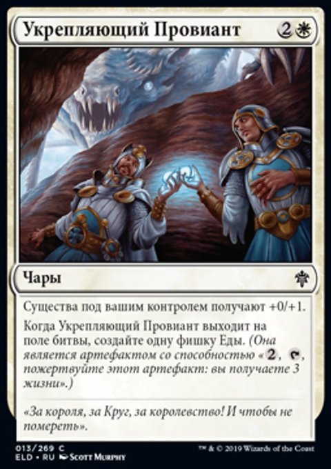 Когда Укрепляющий Провиант выходит на поле битвы, создайте одну фишку Еды. (Она является артефактом со способностью «