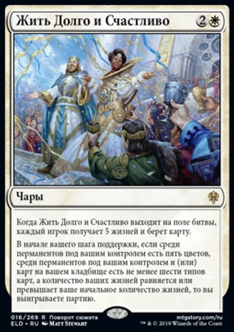 Когда Жить Долго и Счастливо выходит на поле битвы, каждый игрок получает 5 жизней и берет карту.