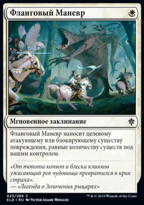 Фланговый Маневр наносит целевому атакующему или блокирующему существу повреждения, равные количеству существ под вашим контролем.