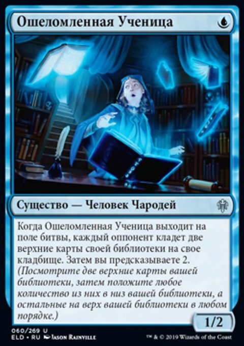 Когда Ошеломленная Ученица выходит на поле битвы, каждый оппонент кладет две верхние карты своей библиотеки на свое кладбище. Затем вы предсказываете 2. (Посмотрите две верхние карты вашей библиотеки, затем положите любое количество из них в низ вашей библиотеки, а остальные на верх вашей библиотеки в любом порядке.)