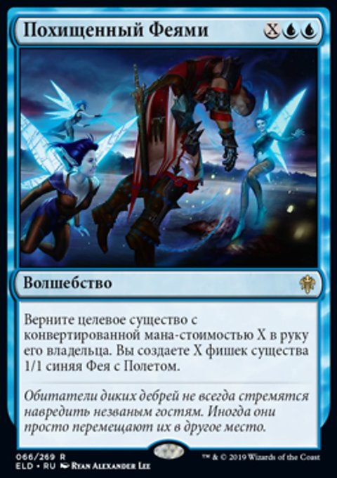 Верните целевое существо с конвертированной мана-стоимостью X в руку его владельца. Вы создаете X фишек существа 1/1 синяя Фея с Полетом.