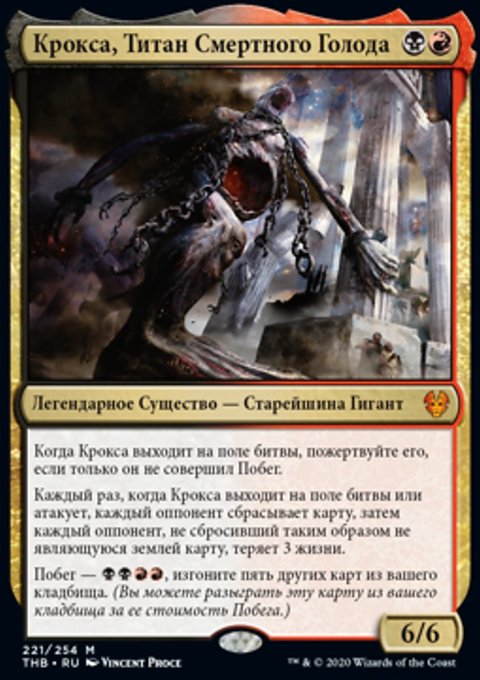 Каждый раз, когда Крокса выходит на поле битвы или атакует, каждый оппонент сбрасывает карту, затем каждый оппонент, не сбросивший таким образом не являющуюся землей карту, теряет 3 жизни.