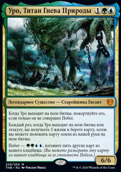 Каждый раз, когда Уро выходит на поле битвы или атакует, вы получаете 3 жизни и берете карту, затем вы можете положить карту земли из вашей руки на поле битвы.