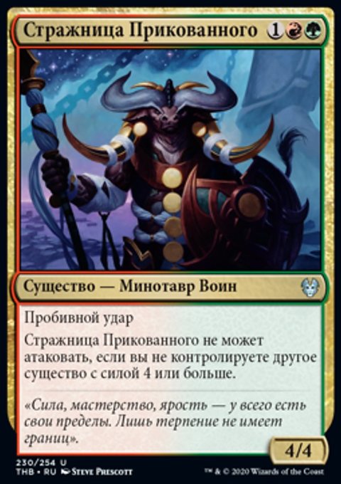 Стражница Прикованного не может атаковать, если вы не контролируете другое существо с силой 4 или больше.