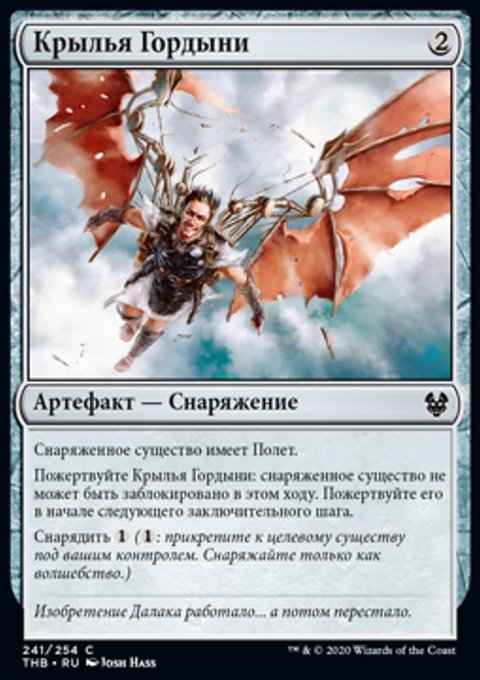 Пожертвуйте Крылья Гордыни: снаряженное существо не может быть заблокировано в этом ходу. Пожертвуйте его в начале следующего заключительного шага.