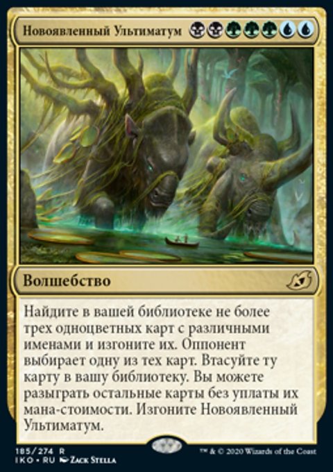 Search your library for up to three monocolored cards with different names and exile them. An opponent chooses one of those cards. Shuffle that card into your library. You may cast the other cards without paying their mana costs. Exile Emergent Ultimatum.