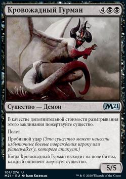 Когда Кровожадный Гурман выходит на поле битвы, каждый оппонент жертвует существо.