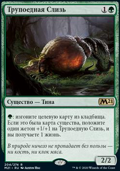 : изгоните целевую карту из кладбища. Если это была карта существа, положите один жетон +1/+1 на Трупоедную Слизь, и вы получаете 1 жизнь.