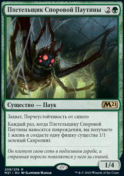 Каждый раз, когда Плетельщику Споровой Паутины наносятся повреждения, вы получаете 1 жизнь и создаете одну фишку существа 1/1 зеленый Сапролинг.