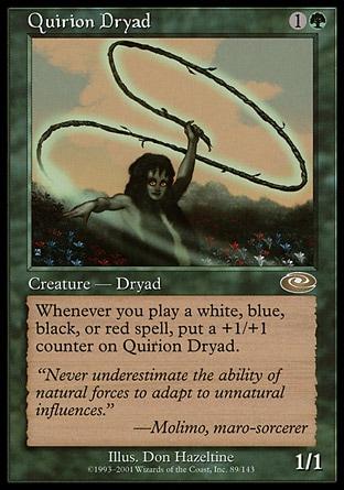 Каждый раз, когда вы разыгрываете белое, синее, черное или красное заклинание, положите один жетон +1/+1 на Квирионскую Дриаду.