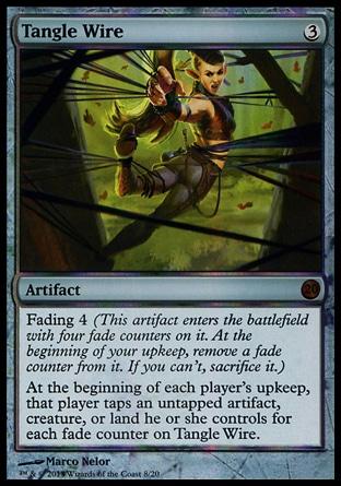 At the beginning of each player's upkeep, that player taps an untapped artifact, creature, or land he or she controls for each fade counter on Tangle Wire.